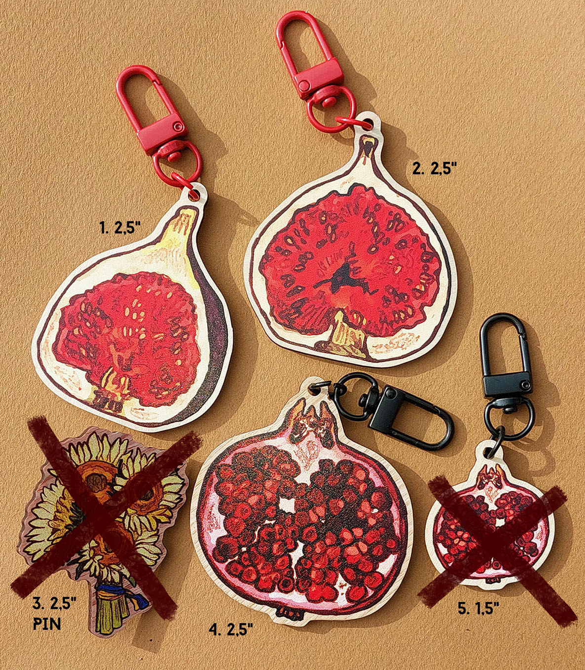 Quality, printed fake wood pin and charms (looks exactly like real wood) Size: 2,5 inches for 4 of them, 1,5 for the small one.